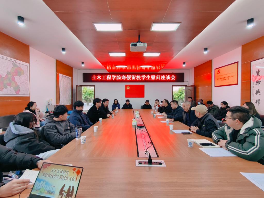 寒冬腊月,年味渐浓。当多数学子返回家乡,土木工程学院仍有一群坚守的学生身影。为切实关心寒假留校学生的学习生活,倾听学子心声,关心学生成长,2月1日下午,土木工程学院在学院会议室召开2026年寒假留校学生慰问座谈会。校党委常委、学院党委书记冯瑞胜,学院院长张学富,学院党委副书记杜嘉、谭涛,学工办主任秦静波,2023级研究生辅导员李红,21名留校博士、硕士及本科生代表参加座谈。