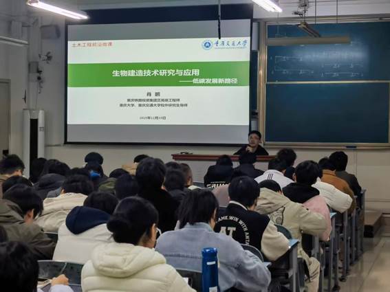 2025年12月15日晚上19:00-22:10,重庆交通大学土木工程学院教师涂义亮和王旭特邀重庆铁路投资集团正高级工程师肖鹏莅临南岸校区,为学院师生带来题为《生物建造技术研究与应用——低碳发展新路径》的2场专题讲座。肖鹏工程师深耕土木建筑领域多年,兼具深厚的理论积淀与丰富的工程实践经验,此次授课聚焦生物建造这一新兴交叉学科,吸引了近300名师生前来聆听,现场座无虚席,气氛热烈,以求共同探寻建筑业降耗减碳的创新方向。