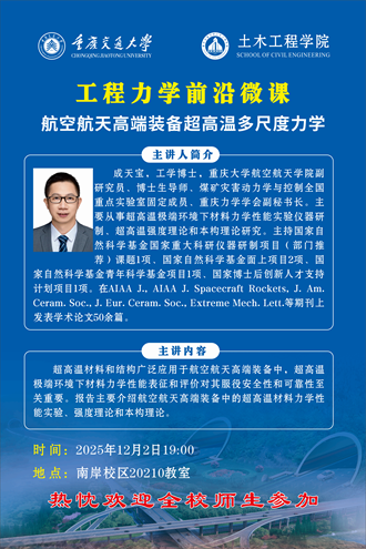 2025年12月2日,土木工程学院力学系邀请重庆大学成天宝教授作了题为“航空航天高端装备超高温多尺度力学”学术讲座,本次讲座有60余名学生参加。