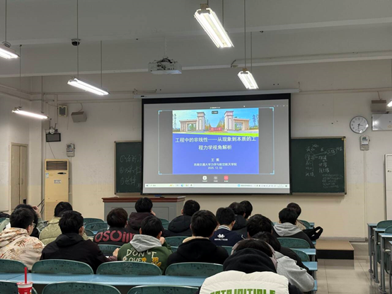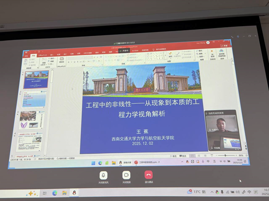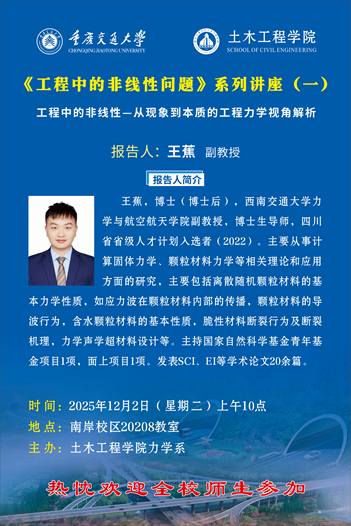 2025年12月2日,土木工程学院工程力学系特邀西南交通大学力学与航空航天学院王蕉副教授作了题为“工程中的非线性——从现象到本质的工程力学视角解析”专题讲座,本次讲座通过线上线下相结合的方式举行,我校六十余名师生在南岸校区20208教室集中收听,踊跃参与。