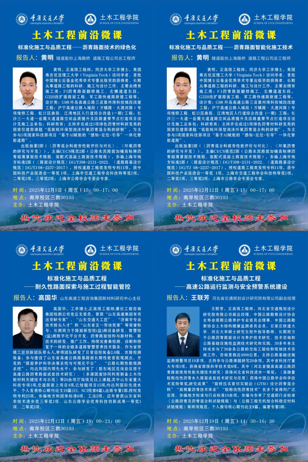 为深化产教融合、对标行业前沿,着力培育土木工程专业学子的工程实践能力与标准化施工理念,土木工程学院于2025年12月5日至19日成功举办《土木工程前沿微课》——“标准化施工与品质工程”系列专题讲座。本次系列讲座邀请三位行业权威专家主讲,搭建了高水平产学研交流平台。